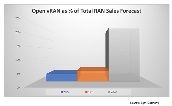 因此,由于業(yè)內(nèi)的一些質(zhì)疑,Open vRAN市場(chǎng)將出現(xiàn)短期(2023-2024年)暫停。LC對(duì)2023年的預(yù)測(cè)被向下修正,但仍顯示增長(zhǎng)。好消息是,全世界都越來(lái)越一致地認(rèn)為,Open vRAN將在本十年的后半段成為移動(dòng)網(wǎng)絡(luò)的主要架構(gòu)組件。因此,該市場(chǎng)2022-2028年的復(fù)合年增長(zhǎng)率為33%,到2028年,Open vRAN將占全球RAN總銷售額的20%以上。